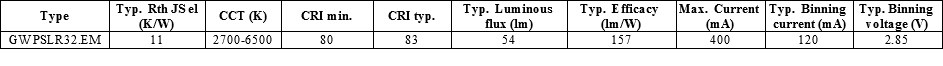 - Höchste Effizienz für grüne LEDs überhaupt: 180 lm/W @ 150 mA