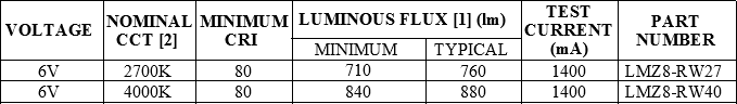 N otes for Table 1: 1. Lumileds maintains a tolerance of ±2 on CRI and ±6.5% on luminous flux measurements. 2. Typical CRI is approximately 2 points higher than the minimum CRI specified, but this is not guaranteed.