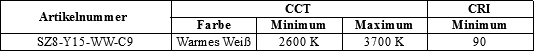 1. Die korrelierte Farbtemperatur ist aus dem CIE 1931 Chromatizitätsdiagramm abgeleitet. Farbkoordinate: +- 5% Toleranz.